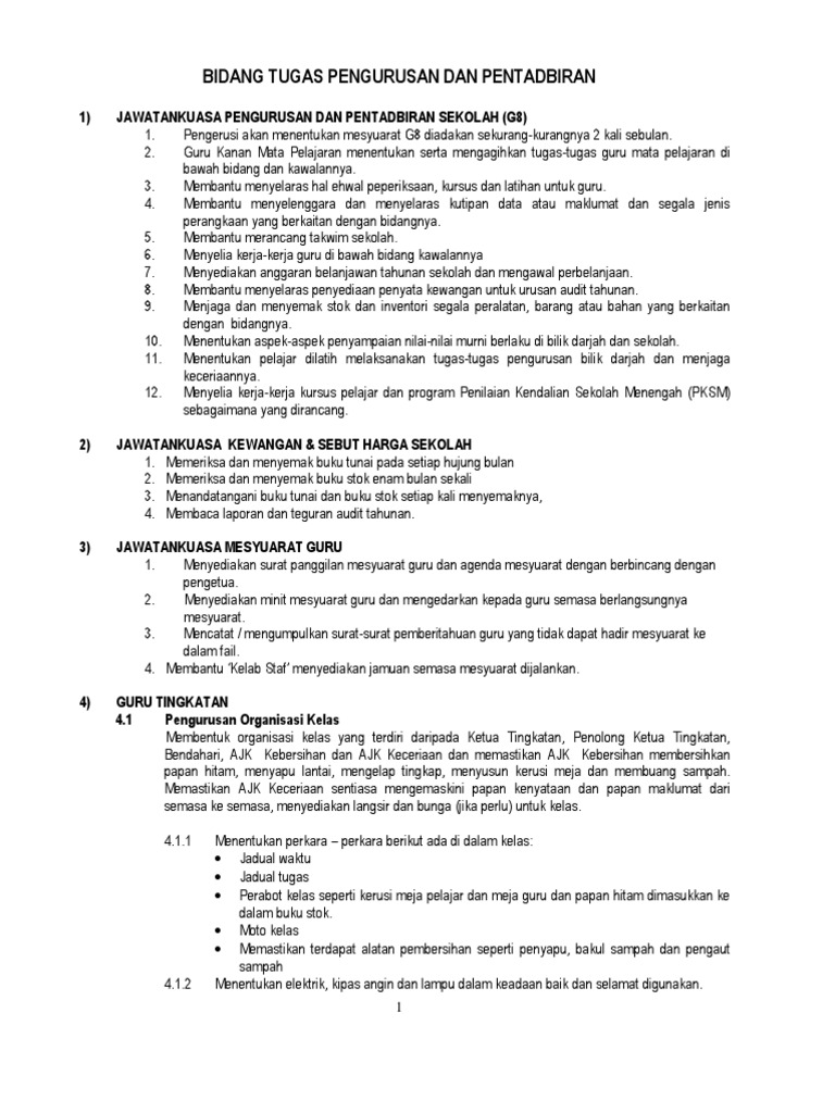 Bidang Tugas dan Tanggungjawab Ahli-ahli Jawatan Kuasa Pengerusi Bertanggungjawab dalam menguruskan pentadbiran kewangan dan aktiviti. 01032018 bidang tugas skop kerja bagi setiap jawatan yang terdapat di sekolah - senarai tugas jk pentadbiran tugas dan tanggungjawab unit kurikulum tugas gpk pentadbiran tugas gpk hal ehwal murid tugas gpk kokurikulum tugas guru data tugas guru media tugas guru penyelaras bestari tugas guru tugas juruteknik komputer tugas pembantu tadbir tugas pembantu operasi tugas. - Pada menu Maklumat Pengisian klik Hantar.