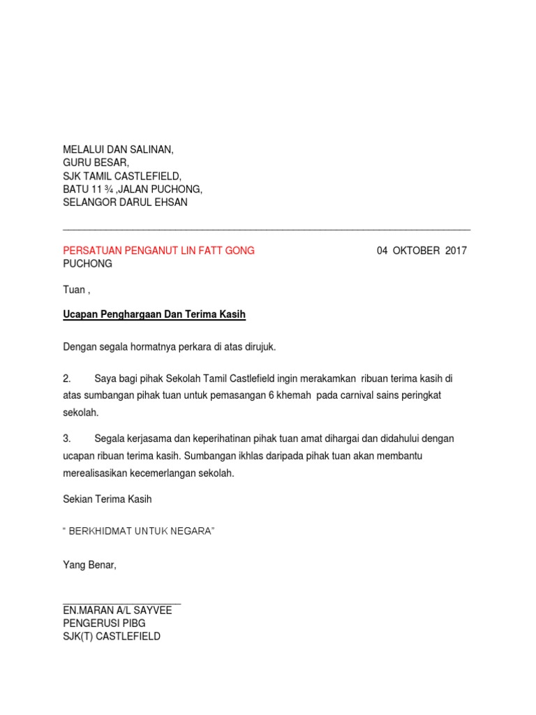 Surat Perhargaan Dan Terima Kasih Atas Sumbangan